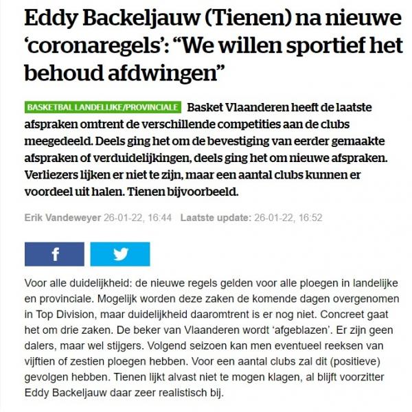 HLN 26 JAN 2022: E.B. "We willen sportief het behoud afdwingen" / 29 January 2022 / 0 Comments Ingediend door admin4 op 29 January 2022 HLN 26 JAN 2022 : https://www.hln.be/sport-in-de-buurt/eddy-backeljauw-tienen-na-nieuwe-coronaregels-we-willen-sportief-het-behoud-afdwingen~afc5c8c2/ Login om te reageren