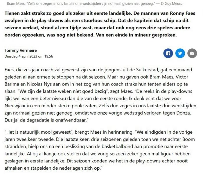 Bram Maes verlaat Tienen met degradatie: “Al bij al hebben we in eerste landelijke geen mal figuur geslagen” / 5 April 2023 / 0 Comments Ingediend door admin4 op 5 April 2023 NIEUWSBLAD 04/04/2023: https://www.nieuwsblad.be/cnt/dmf20230404_96460156 Login om te reageren