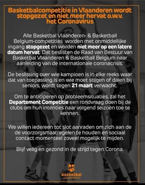 De wijzigende omstandigheden dwingen ons om hier snel, flexibel en wendbaar op in te spelen. Het is volstrekt onmogelijk om op dit ogenblik tot een sluitende en limitatieve lijst van opties ‘wat te doen als’ te komen. Intussen is het voor iedereen duidelijk dat deze omstandigheden snel kunnen wisselen, met als gevolg dat beslissingen zich opdringen die afwijken van de regels, zoals bepaald in het Intern Reglement van Basketbal Vlaanderen.